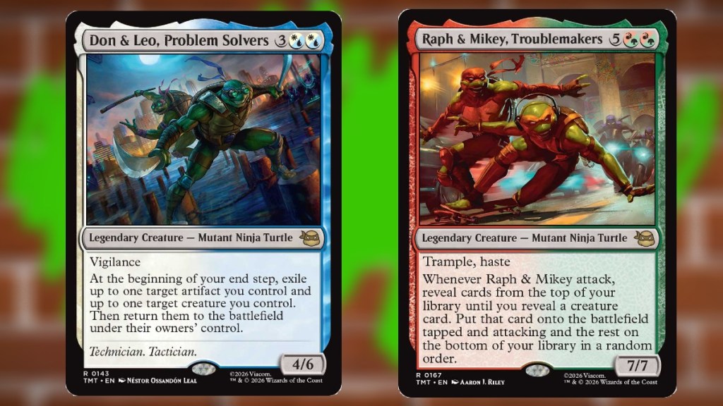 To continue capturing the “vibe” of TMNT through MTG, each turtle has a team-up card that helps symbolize their familial relationships, which are integral to the turtles’ story. For example, there is the rare “Don & Leo, Problem Solvers” card, which includes the more responsible brothers. On the flip side, there is also the rare “Raph & Mikey, Troublemakers” card, which features the two more troublesome brothers.